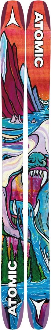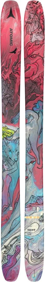Der Atomic Bent 110 verfolgt einen ganz ähnlichen Ansatz am Berg wie der Bent Chetler 120, allerdings hat er etwas weniger Mittelbreite. Er ist Jossi Wells‘ Ski der Wahl für Backcountry-Freestyle-Sessions, lässige Lines unter dem Lift und tiefen Powder – aber eben nicht so tief, als dass der 120er übernehmen sollte. Der Bent 110 ist mit HRZN Tech Tip & Tail ausgestattet – für verspielte Performance und sensationellen Auftrieb im Tiefschnee, ohne dass der Ski breiter oder schwerer wird. Er hat etwas weniger Rocker am Skiende als der 120er, meistert zerfahrenen Schnee oder Bruchharsch dennoch souverän. Sein Light Woodcore sorgt für geringes Gewicht und zugleich Agilität und Spritzigkeit. Die kunstvollen Grafiken von Chris Benchetler auf dem Topsheet und Belag lassen keine Zweifel, worum es bei diesem Ski geht: Kreativität und Individualität.