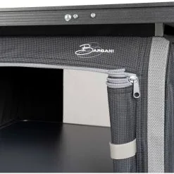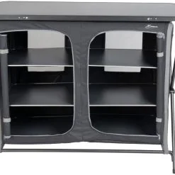 The Bardani Ripiani X6 camping cupboard is equipped with a gray 600 D polyester fabric. In addition, the Bardani camping cupboard has an aluminum frame and an MDF top. Thanks to this tray, you can put things on the cupboard in addition to things in the cupboard. The camping cupboard has a total of 6 shelves.