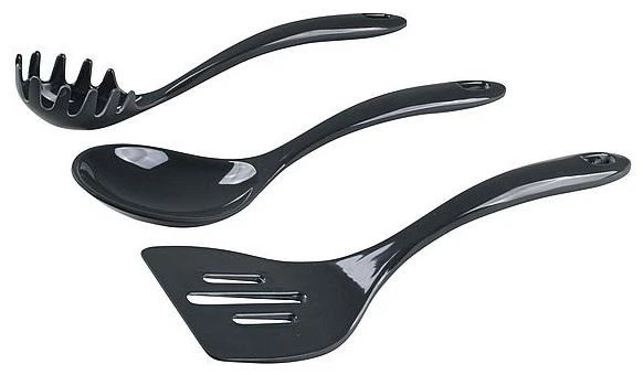 Ein 3-teiliges Besteckset für einfaches Schöpfen von Lebensmitteln. Hergestellt aus 100% Melamin. Das Set ist sehr leicht, praktisch unzerbrechlich, kratzfest und spülmaschinenfest. Ideal für Zuhause oder Camping.