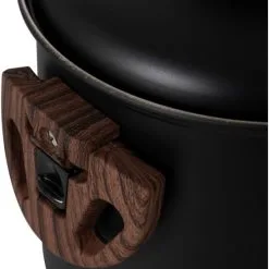 An industrial 2-part stainless steel pan set. Every pan has a glass lid with heat-resistant knob. The pans have an industrial look because of black stainless steel and the woodlook buttons. In addition, every pan has heat-resistant and retractable hand grips. These hand grips can be easily folded after use so that the pans are fully nestable and compact to store.