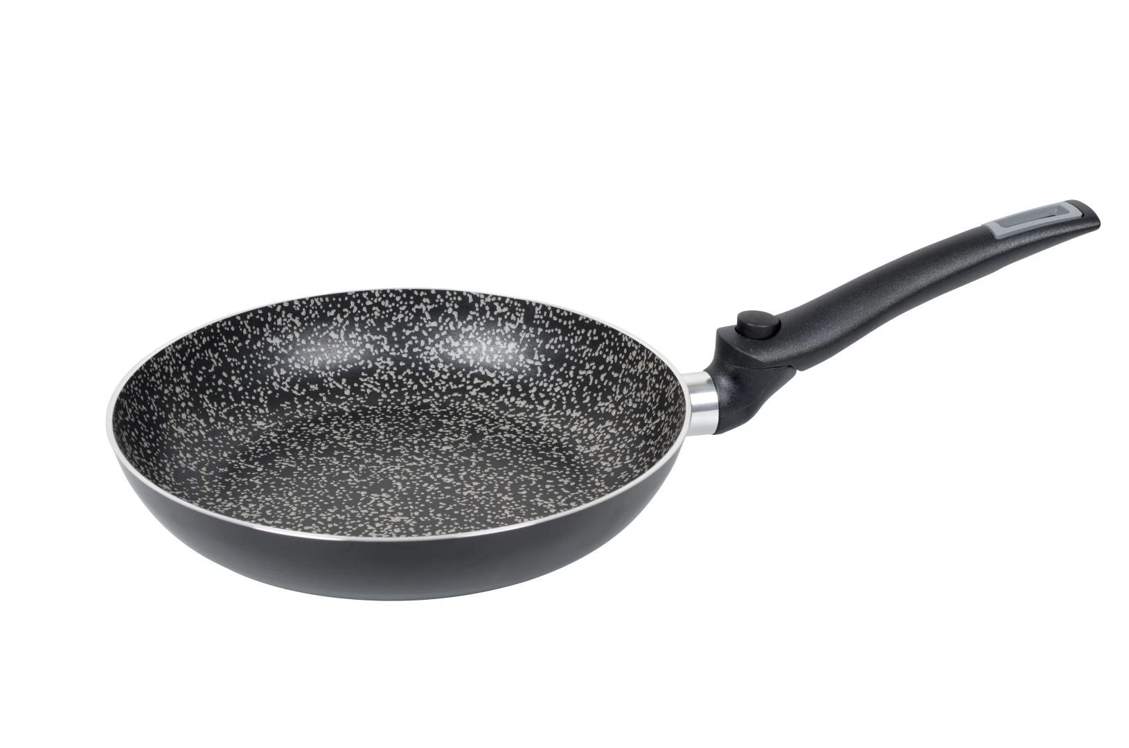 An aluminium frying pan with foldaway handle. Comes with a 5 layer Salus Stone coating and an anti-slip base. This pan has a foldaway handle and therefore makes good use of space and is easy to take with you. Dishwasher safe and suitable for heat sources gas, ceramic,electric and induction. Thickness: 2.5 millimetres..