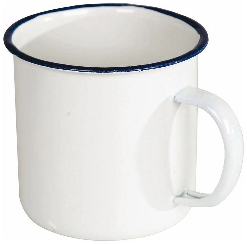 Een stevige stalen mok. De mok is geëmailleerd, dus voorzien van een harde emaille laag die zorgt voor extra hygiëne en stevigheid. Tevens is emaille hittebestendig en duurzaam. De mok is gedecoreerd met een blauwe rand.