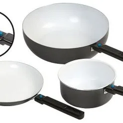 Eine kompakte Wok-Pfanne mit keramischer Beschichtung. Ideal fĂŒr das RĂŒhrbraten von Fleisch, Fisch oder GemĂŒse. Diese Pfanne ist mit einem abnehmbaren Handgriff ausgerĂŒstet, und ist deshalb platzsparend. Die keramische Beschichtung verhindert das Ankleben, ist kratzfest und leicht zu reinigen. DarĂŒber hinaus ist es ein gesĂŒnderes Kochen, da weniger Fett zum Braten erforderlich ist. Kann auf Gas-, Keramik- und Elektro-WĂ€rmequellen verwendet werden. Dicke: 2,2 mm.