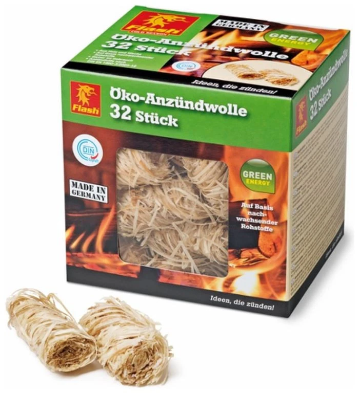 Die Öko-Anzündwolle der Marke FLASH besteht aus Naturholz & einem pflanzlich-basierten Wachs. Das Produkt ist geeignet zum sicheren, geruchsarmen und sauberen Anzünden von Grill, Ofen und Kamin. Anzündwolle ist ein FSC®-zertifiziertes Produkt aus 100 % nachwachsenden Rohstoffen und entspricht der Norm für Grillanzünder DIN EN 1860-3. In der Schachtel sind mindestens 32 Anzünder enthalten. Die Form dieser Anzünder wird auch oft als Feuerbällchen oder Zündwolli beschrieben.