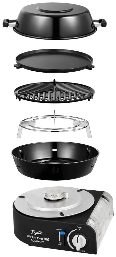 Trotz seiner geringen Größe ist der Safari Chef 30 Compact äußerst vielseitig, da er über verschiedene Kochflächen verfügt: einen Topständer, eine Grillplatte (nicht bei LITE-Version), ein Grillrost und einen Deckel, der auch als Topf genutzt werden kann. Auf dem Topfständer kannst du problemlos einen Topf mit Suppe oder Nudeln kochen. Der Grillrost und die Grillplatte sind mit der GreenGrill-Beschichtung von CADAC versehen und eignen sich perfekt zum Braten und Grillen von Fleisch, Fisch und Gemüse. Der Deckel kann auch als (Suppen-)Topf verwendet werden und ist somit multifunktional.