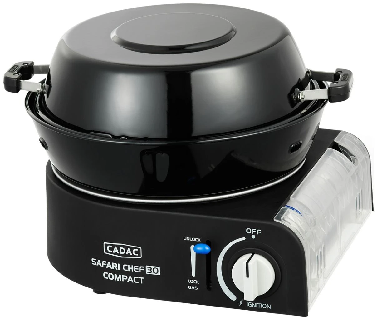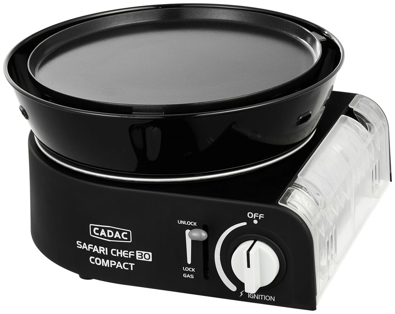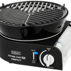 Der neue Safari Chef 30 Compact ist ein ultrakompakter, leichter Gasgrill. Dieser Grill arbeitet direkt mit einer 227gr-Bajonettkartusche; einfach die Gaskartusche in das Gerät einsetzen, einklicken und schon kann man mit dem Kochen oder Grillen beginnen. Ein ideales Gerät für Outdoor-Aktivitäten und Campingurlaube.