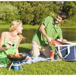 When you’re done eating, the camping party grill can be stored away compactly. The removable frame can be even stored inside the stove! The lid clicks securely into place so the party grill takes up hardly any space.