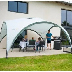 Dieser Unterschlupf besteht aus Polyester mit einer Wassersäule von 1000 mm. Die Nähte sind zugeklebt. Wasserdicht bei leichtem Regen, aber dank UV-Schutz auf der Leinwand besonders geeignet als Schutz vor der Sonne an Sommertagen.