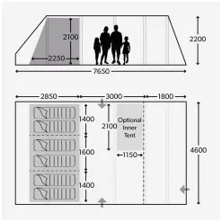 De tent biedt slaapruimte aan 6 personen. Er kan optioneel nog een losse slaapcabine worden ingehangen, zodat er 7 personen in de tent kunnen slapen. Â