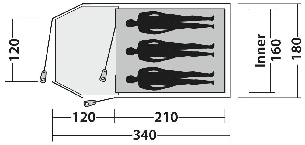 Mit Platz für drei Personen in einem Kuppelzelt mit großer Frontfläche hat das Blazar 300 ein vielseitiges Design mit Fiberglasstangen, ideal für Paare und junge Familien und Freunde. Der Frontbereich mit abnehmbarer Bodenplane verfügt über eine große Vordertür sowie eine Seitentür mit Fenstern und regendichten Lüftungsschlitzen sowie eine große Lüftungsöffnung an der Rückseite des Zeltes. Das Innenzelt hat eine D-förmige Tür und einen praktischen Aufhängepunkt für Laternen.