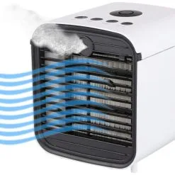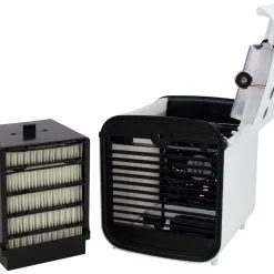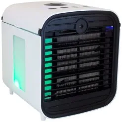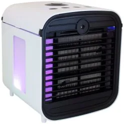 Der Kühler kühlt die Luft um Sie herum, befeuchtet sie und reinigt sie. Das beste Kühlergebnis wird durch Zugabe von gefrorenem Wasser zum Reservoir erzielt. Je kälter das Wasser im Reservoir, desto kälter die abgegebende Luft. Hinweis: Der Luftkühler ist keine mobile Klimaanlage. Es ist ein Ventilator, der durch das kalte Wasser einen kühleren Wind erzeugt.
