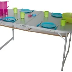 Large aluminum folding camping table and waterproof sheet! Table is foldable and equipped with adjustable feet (3 positions). The Eurotrail Crouzet has a newspaper net beneath the top for storing newspapers, etc.