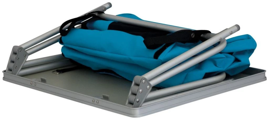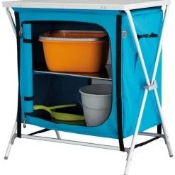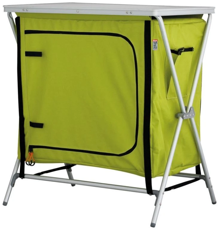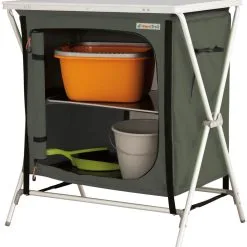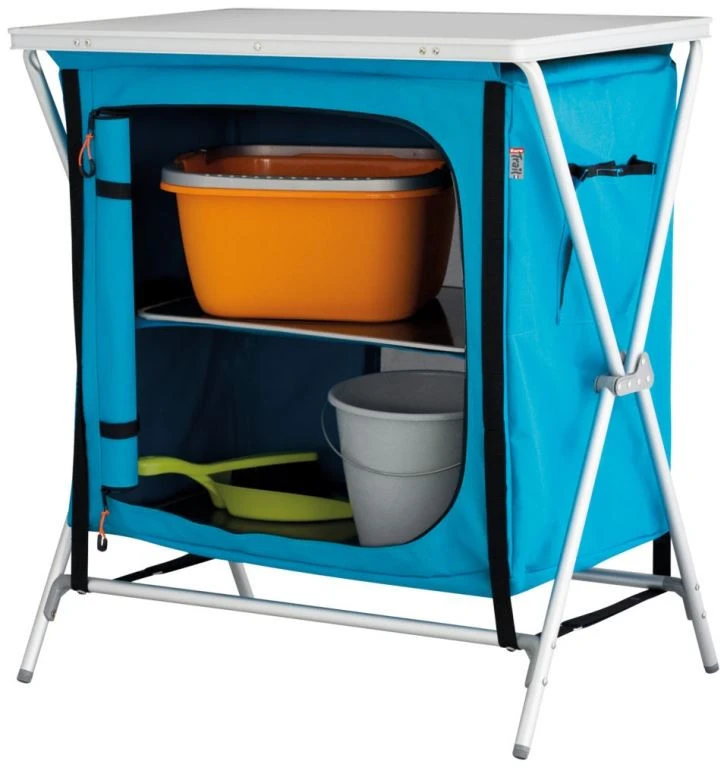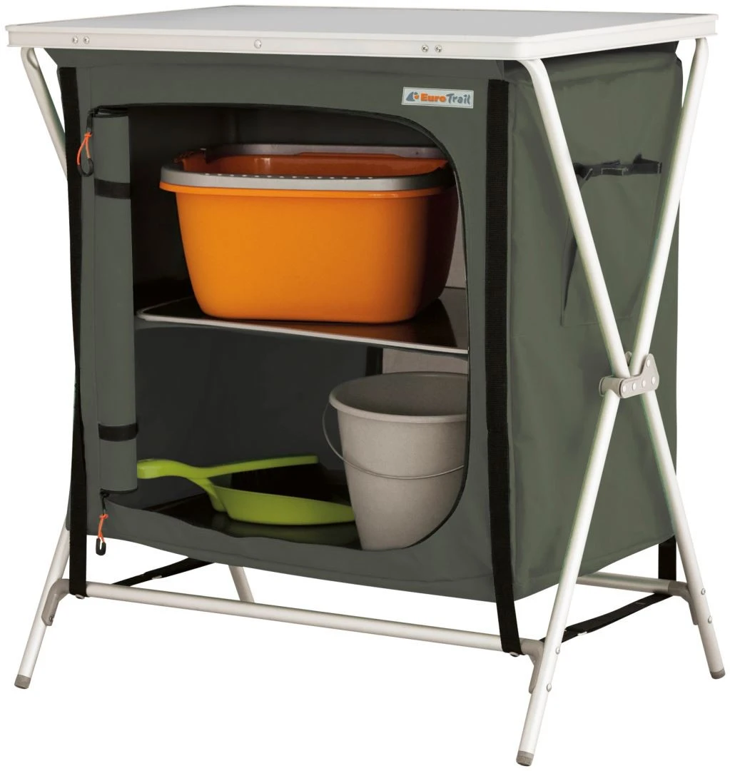 Praktischer Klappschrank. Eurotrail St. Barts kommt mit einem oberen Brett. Die Regale sind mit einem Aluminiumrand versehen, so dass sie nicht durch Taschen gehen. Verstellbare FĂĽĂźe und mitgelieferte Aufbewahrungstasche.