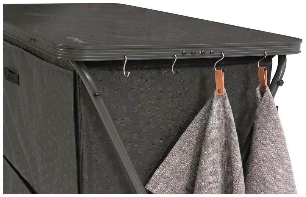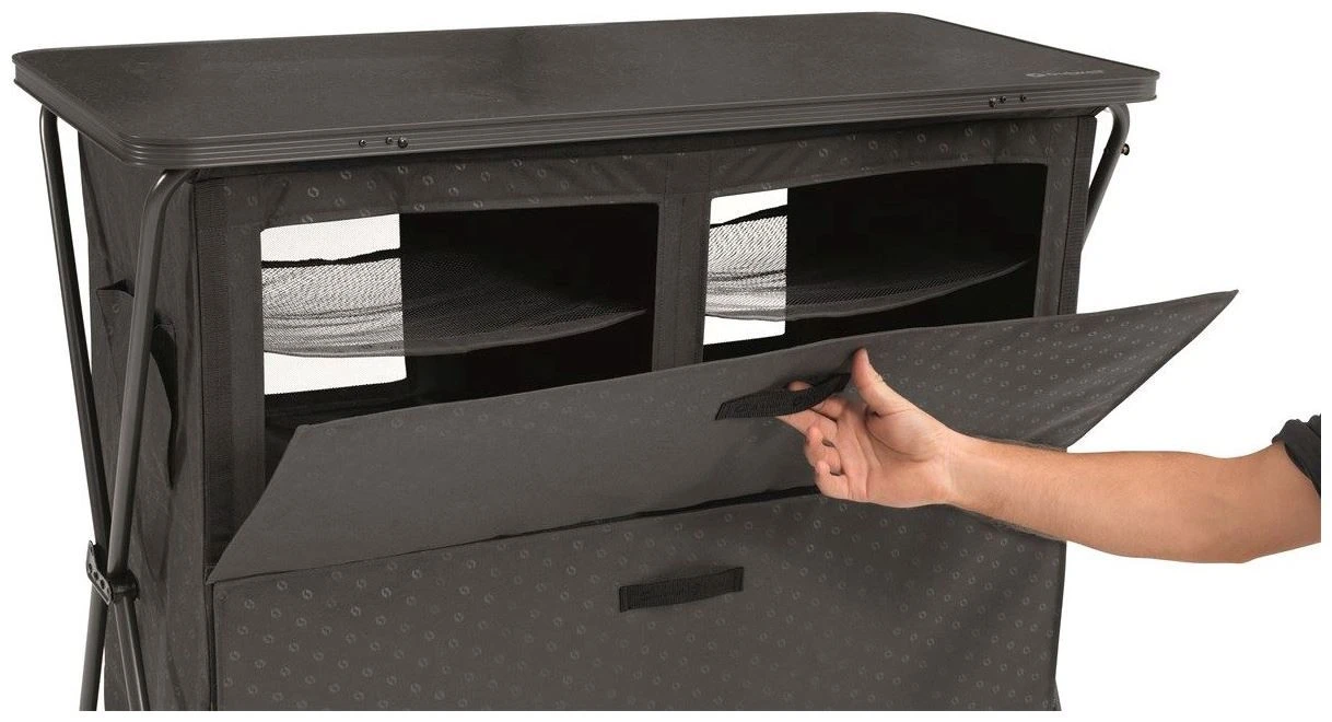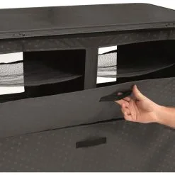 Die robuste, herunterklappbare Tür mit Griff bietet einen einfach und geräuscharm nutzbaren Stauraum wie zu Hause. Tür mit Magnetverschluss. Vier große, stabile Fächer und zwei Netzfächer. Organiser-Tasche an der Seite. Netzeinsätze für Luftzirkulation. Haken zum Aufhängen an der Seite. Keine Montage erforderlich. Aufgeklappt und zusammengefaltet in Sekunden.