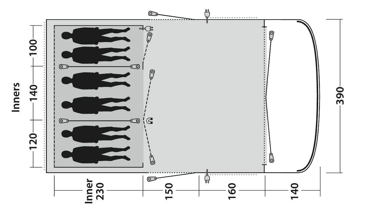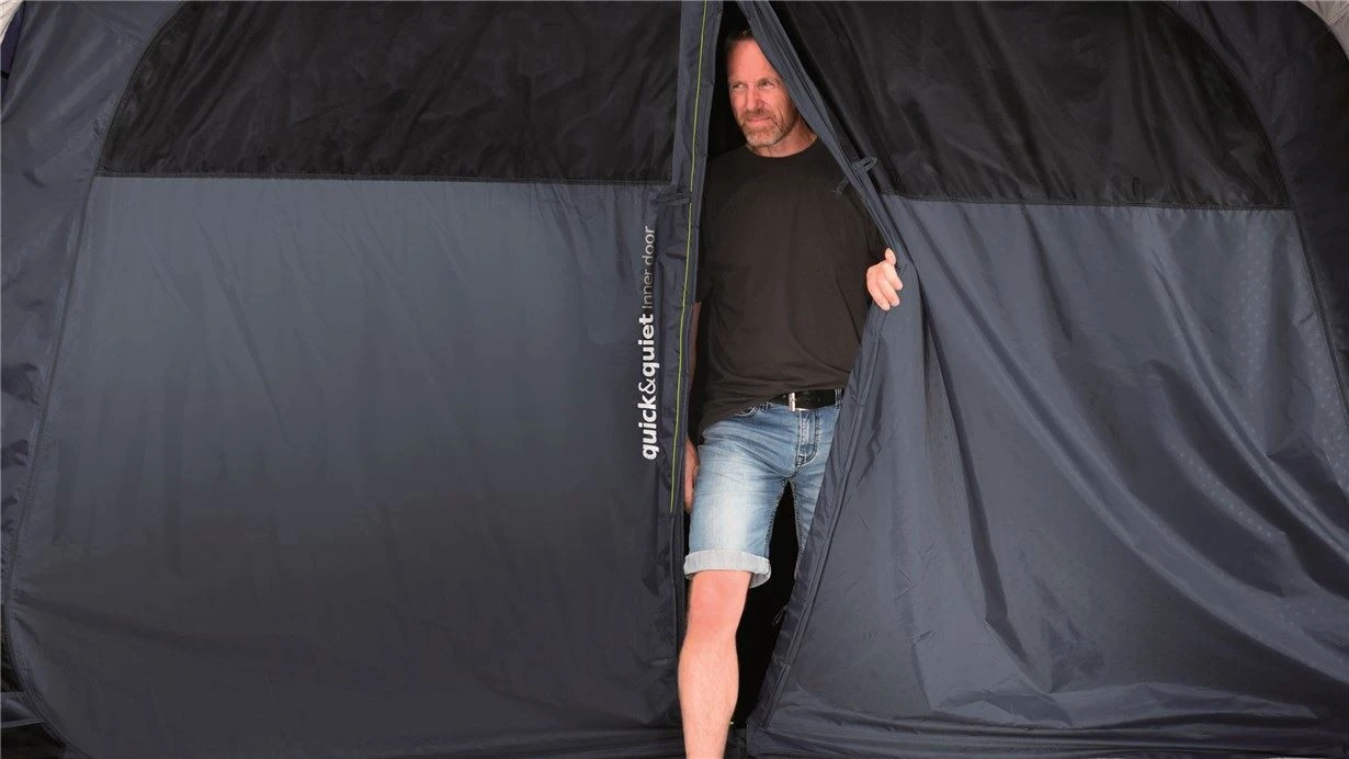 Das Colorado 6PE beherbergt sechs Personen in drei Master-Schlafkabinen vom Typ Ambassador, die mit abgedunkelten Innenzelten und den Quick & Quiet Inner Doors ausgestattet sind. Abgerundet wird das Design mit einem erweiterten Vorraum. Die beiden D-förmigen Türen sind mit Netzeinsätzen versehen und bieten neben einem flexiblen Zugang auch gute Belüftungsmöglichkeiten. Die vorgebogenen Stangen unseres Power Stability System gewährleisten eine hervorragende Stabilität, während die steilen Wände den nutzbaren Innenraum maximieren und im ganzen Zelt für volle Kopffreiheit sorgen. Mit dem Outwell HookTrack System, dem Easy Pegging System, der Kabeldurchführung, den Vorhängen mit Reißverschluss und unserem Rear Ventilation System ist ein so hoher Komfort garantiert, dass sich die Zeltbewohner wie zu Hause fühlen können.