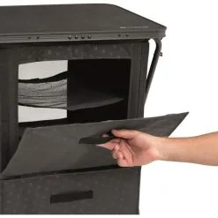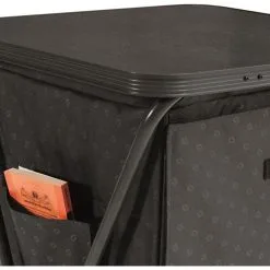 Die robuste, herunterklappbare Tür mit Griff bietet einen einfach und geräuscharm nutzbaren Stauraum wie zu Hause. Tür mit Magnetverschluss. Zwei große Fächer und ein Netzfach. Organiser-Tasche an der Seite. Netzeinsätze für Luftzirkulation. Haken zum Aufhängen an der Seite. Keine Montage erforderlich. Aufgeklappt und zusammengefaltet in Sekunden.
