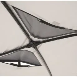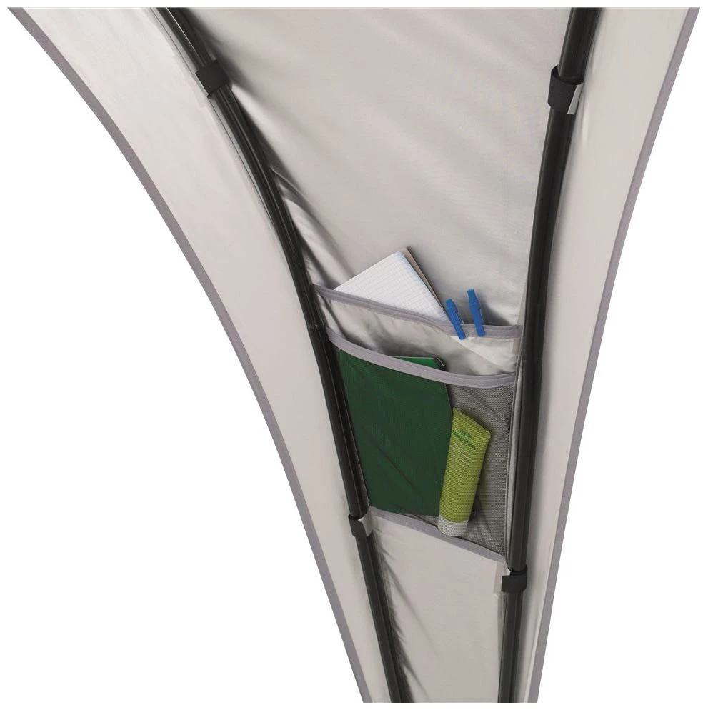 Die Outwell Event Lounge M bietet einen vielseitig nutzbaren, frei stehenden Unterschlupf. Die äußerst robuste und stabile Konstruktion zeichnet sich durch große Zugänge und eine bequeme Stehhöhe aus. Dank der Belüftungsöffnung an der Spitze, dem Aufhängepunkt für eine Laterne in der Mitte sowie zwei Netztaschen bietet die Lounge ein Höchstmaß an praktischer Flexibilität. Das Polyester ist mit einer Silber- und PU-Beschichtung versehen, sodass es einer Wassersäule von 1500 mm standhält. Um einen größeren geschützten Aufenthaltsbereich zu schaffen, können miteinander kompatible Schutzdächer über eine Regenrinne verbunden werden.
