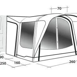 Das aufblasbare Vorzelt Newburg 160 Air bietet trotz der kompakten Größe einen großzügigen und lichtdurchfluteten Innenraum. Der Schleusenbereich mit seinen beiden Seiteneingängen kann mit der mitgelieferten Bodenplane zusätzlich als Wohnraum genutzt werden und vergrößert so den nutzbaren Aufenthaltsbereich. Die komplett zu öffnende Front ist mit einem Moskitonetz ausgestattet und wird durch ein Vordach geschützt. Das Vorzelt lässt sich mithilfe eines Doppel-Keders (5 und 7 mm) oder mit Leinen an Campervans mit einer Höhe zwischen 175 und 200 cm anbauen.