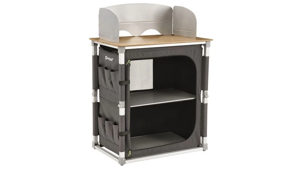 Aus schickem schwarz-grauem Stoff mit massiver Bambustischplatte – mit drei praktischen Haken auf der einen Seite und einer Stautasche auf der anderen Seite. Der Küchentisch enthält einen Halter zum Ausziehen, in dem eine Abwaschschüssel oder ein Müllbeutel Platz findet, sowie einen Windschutz, der verhindert, dass die Flammen eines Brenners ausgeblasen werden.