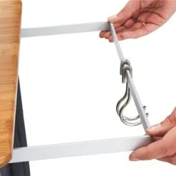 Aus schickem schwarz-grauem Stoff mit massiver Bambustischplatte – mit drei praktischen Haken auf der einen Seite und einer Stautasche auf der anderen Seite. Der Küchentisch enthält einen Halter zum Ausziehen, in dem eine Abwaschschüssel oder ein Müllbeutel Platz findet, sowie einen Windschutz, der verhindert, dass die Flammen eines Brenners ausgeblasen werden.