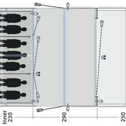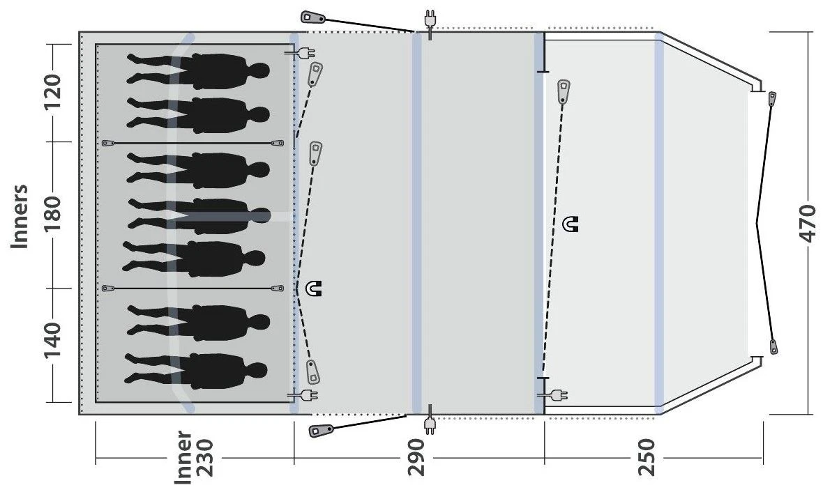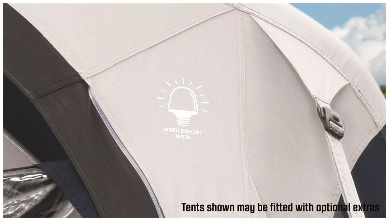 With its wide design and the huge amount of versatile space it is ideal for larger families and for inviting friends to share. Its technical cotton fabric maintains a pleasant internal temperature, perfect for the sunshine of Southern Europe as well as on colder days. Ventilation is easily boosted on very hot days by the mesh doors in both sides of the living area. With the addition of an optional ONS Light Unit Set, the welcoming Outwell Nightlight System (patented) at the front door guides you when darkness falls and the ONS inside the tent creates a cosy atmosphere through the evening.