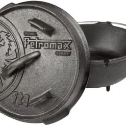 Een traditionele en multifunctionele gietijzeren pan. Deze Dutch Oven is uitermate geschikt voor het bereiden van maaltijden boven open vuur of op hete kolen. Het massieve gietijzer verdeelt de warmte zodat de pan zonder problemen kan worden gebruikt om te bakken, braden, frituren, koken of stoven. De pan is voorzien van een ‚pre-seasoned‘ coating tegen aanbakken en roesten. Kan tevens worden gebruikt als oven door gloeiende houtskoolbriketten op het deksel en om de pan te plaatsen. Het deksel is voorzien van 3 kleine pootjes en een opstaande rand. Zo kan het deksel tevens worden gebruikt als koekenpan, hapjespan of als schaal. Aan de onderkant bevinden zich eveneens 3 pootjes zodat de pan stabiel in het vuur kan worden geplaatst. Voorzien van een kleine opening voor gebruik van een thermometer en een hengsel om de pan op te hangen aan de Cooking driepoot. Afmetingen (Øxh): 25×16 cm. Inhoud: 2,3 Liter.