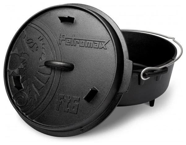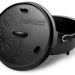 Een traditionele en multifunctionele gietijzeren pan. Deze Dutch Oven is uitermate geschikt voor het bereiden van maaltijden boven open vuur of op hete kolen. Het massieve gietijzer verdeelt de warmte zodat de pan zonder problemen kan worden gebruikt om te bakken, braden, frituren, koken of stoven. De pan is voorzien van een ‚pre-seasoned‘ coating tegen aanbakken en roesten. Kan tevens worden gebruikt als oven door gloeiende houtskoolbriketten op het deksel en om de pan te plaatsen. Het deksel is voorzien van 3 kleine pootjes en een opstaande rand. Zo kan het deksel tevens worden gebruikt als koekenpan, hapjespan of als schaal. Aan de onderkant bevinden zich eveneens 3 pootjes zodat de pan stabiel in het vuur kan worden geplaatst. Voorzien van een kleine opening voor gebruik van een thermometer en een hengsel om de pan op te hangen aan de Cooking driepoot. Afmetingen (Øxh): 36×20 cm. Inhoud: 7,6 Liter.
