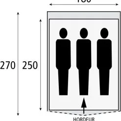 Das Cyclone L Zelt hat eine Größe von 270 x 190 Zentimetern. Der Schlafbereich hat eine Größe von 250 x 180 cm. Das macht dieses Zelt groß genug für drei Personen. Das Zelt hat eine Vordertür, die leicht zu öffnen und zu schließen ist. Das Horn verhindert das Betreten des Zeltes durch Insekten. Darüber hinaus sorgt das Horn in Kombination mit den verwendeten Materialien für eine ausreichende Belüftung, wodurch sich die Temperatur angenehm anfühlt.
