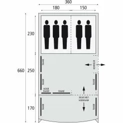 Das Tunnelzelt verfügt über zwei 230 cm lange Schlafkabinen mit extra dunklen Innenzelten. Die erste Schlafkabine bietet Platz für bis zu drei Personen und die zweite Schlafkabine für zwei Personen. Die Schlafkabinen können mittels abtrennbarer Trennwände flexibel angeordnet werden. Der Wohnraum kann durch abnehmbare Trennwände erweitert werden. Das Zelt hat einen Seiteneingang mit einer Moskitonetztür und ausreichend Stauraum dank Aufbewahrungsbeuteln in der Schlafkabine. Das Zelt besteht aus Heringen, Abspannseilen und einer Tragetasche.