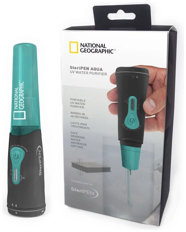 De SteriPEN Aqua is makkelijk in het gebruik: Gewoon op de knop drukken, in het water houden en 48 seconden roeren. Werkt op vier AA-batterijen (niet inbegrepen).